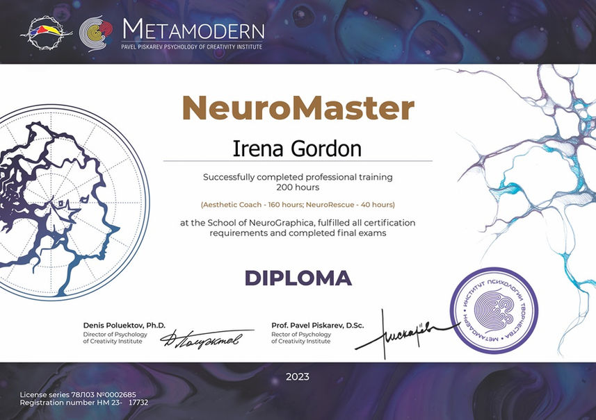 I have heard about NeuroGraphica for a long time. I even watched a video tutorial on YouTube. But didn’t dare to draw. I even included drawing NeuroGraphica in my wish list. And as you know - thoughts are material! My friend Irena Gordon invited me to a lesson on NeuroGraphica. Together with her, I went through 4 lessons. She is a very competent coach and instructor of NeuroGraphica. She tells in an accessible and understandable language, shows and explains everything, and gives easy and very interesting tasks. I’ll be honest that it takes a lot of time at first, but I didn’t regret it because I received lots of positive emotions. The effect of NeuroGraphica comes in the process of work! I recommend everyone to try the course with Irena Gordon. To say excellent, it's nothing to say :) Inspiring, I got universal pleasure.